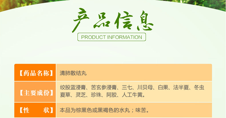 【成 份】绞股蓝浸膏、苦玄参浸膏、三七、川贝母、白果、法半夏、冬虫夏草、灵芝、 珍珠、阿胶、人工牛黄。